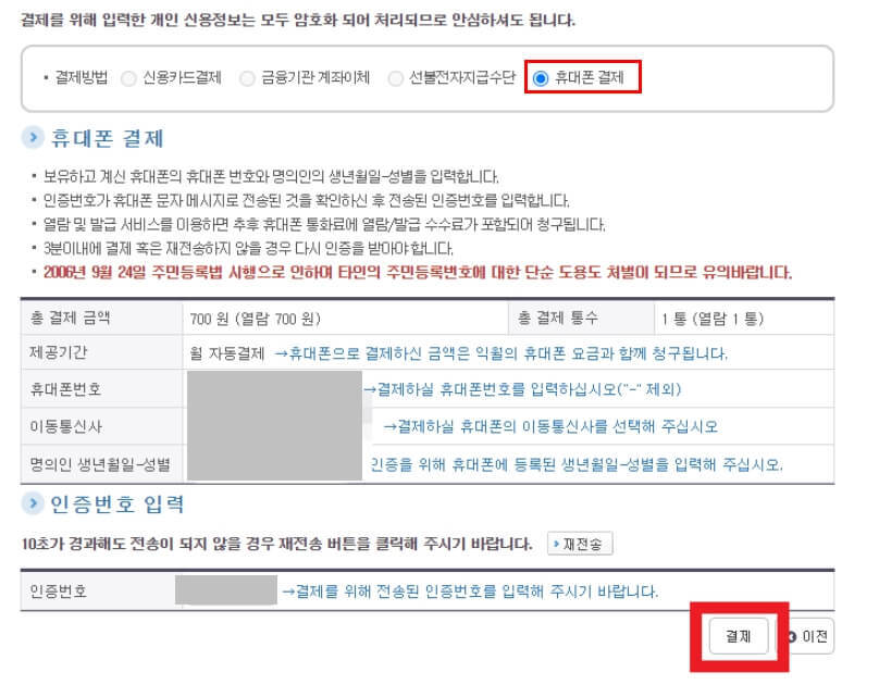 결제를 누르고, 원하는 결제방식을 선택하신 후에 결제를 진행하시기 바랍니다. 그 후, 출력이나 상세 열람이 가능합니다.