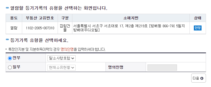 위에서 소유자를 확인하고 선택을 클릭하면 등기사항 유형을 선택하는 화면이 표시되며, 전부 또는 일부를 선택하고 '다음'을 눌러줍니다.