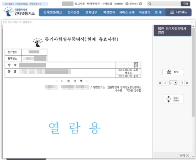 지불이 완료되면 등기부등본 인터넷발급이 완료되며, 열람 또는 출력용으로 사용할 수 있습니다. '출력'을 누르면, 연결된 프린터로 출력이 가능합니다.
