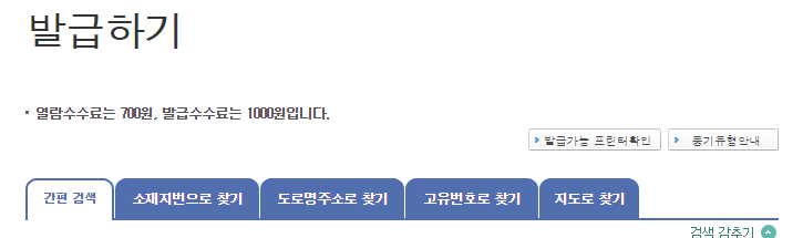 등기부등본 인터넷발급 수수료 1000원, 열람수수료 700원