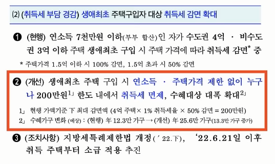 6월 20일에 부동산 정책이 발표되었습니다.  많은 복잡한 내용이 많은데 간단히 지금 소개드리는 내용만 알면 손해 보지 않을 수 있습니다. 우선 취득세 면제 대상은 주택을 살 때 연소득과 주택가격 제한없이 누구나 200만원 한도 내에서 취득세를 면제받을 수 있도록 했습니다. 주택 구매에 대한 취득세가 은근히 부담스러웠는데 잘 수정되었습니다.
