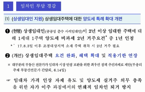 그리고 상생 임대인 제도로 임대료를 5% 이내로 올린 임대인은 '1세대 1주택 양도세 비과세 2년 거주요건’에 대해 면제 받게 됩니다. 좋은 임대인에게 인센티브를 주겠다는 겁니다.