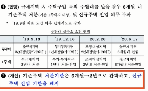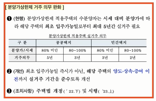 그리고 거주 의무가 달라지게 됩니다. 일단 1주택 처분 조건은 기존 6개월에서 2년으로 완화됩니다. 1주택자에게 굉장히 촉박한 문제였는데 완화되었습니다. 그리고 분양가 상한제 주택 거주 의무도 완화됩니다. 최대 5년 동안 거주해야 하는데, 입주 가능일 즉시가 아닌 양도, 상속 및 증여 이전까지만 실거주 기간을 채워 주기만 하면 되겠습니다.