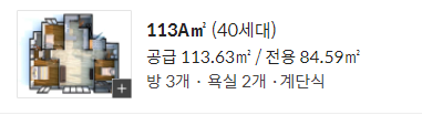 부동산 정보를 살펴보면, 두개의 평형과 ㎡가 그림과 같이 공급면적과 전용면적으로 표시됩니다. 일상생활에서 흔히 말하는 우리 아파트는 몇 평이야는 대부분 공급면적에 대한 이야기입니다.