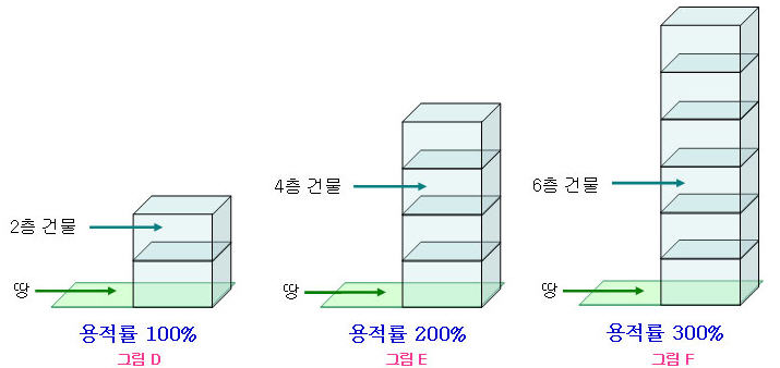 그림D 땅 넓이를 2등분하여 토지넓이만큼 2층건물을 지었으므로 용적률 100%입니다. 그림E D의 2층 건물을 같은 넓이로 4층까지 두배로 지었으니 용적률200%가 됩니다. 그림F D의 2층건물을 6층까지 올려 3배가 되었으니 용적률 300%입니다.