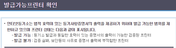 다음은 컴퓨터에 연결된 프린터로 등기부등본 출력이 가능한지 확인하는 단계입니다. 아래와 같은 질문이 나오면, 확인을 누르시고, 아래의 그림처럼 '발급 가능 프린터 확인'을 클립합니다.