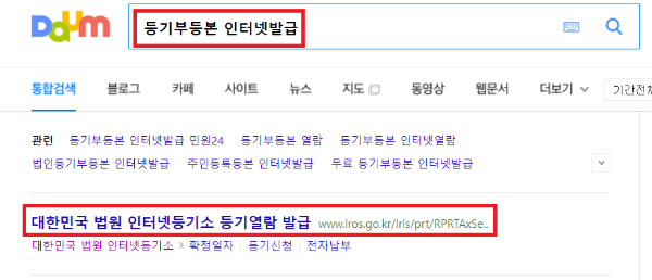 먼저 네이버나 다음같은 검색엔진에서 '등기부등본 인터넷발급'을 검색합니다. 아래와 같이 '대한민국 법원 인터넷등기소 등기 열람 발급' 사이트를 안내합니다.