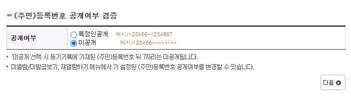 다음은 주민등록번호 공개 여부를 선택합니다. 원하시는 대로 선택하신 후 '다음'을 선택합니다.