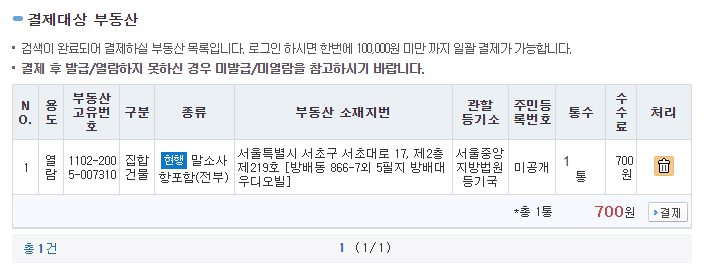 이제 최종 부동산을 확인하신 후에 발급비용 1,000원 결재로 이동합니다. '결제'를 누르시면, 로그인이 과정을 거쳐 카드, 계좌이체, 선불카드, 휴대폰 등으로 결제가 가능합니다.