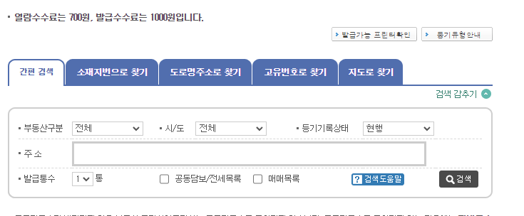 등기부등본 인터넷발급 수수료 1000원, 열람수수료 700원