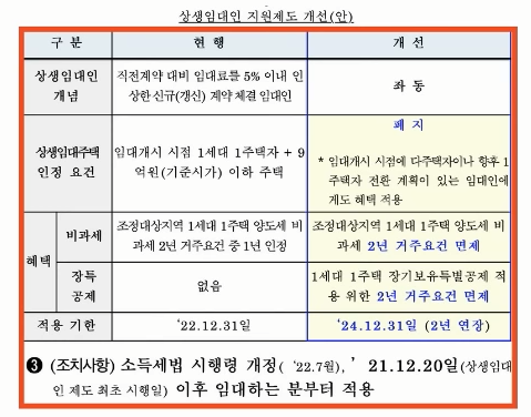 그리고 상생 임대인 제도로 임대료를 5% 이내로 올린 임대인은 '1세대 1주택 양도세 비과세 2년 거주요건’에 대해 면제 받게 됩니다. 좋은 임대인에게 인센티브를 주겠다는 겁니다.