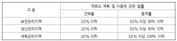 관리지역 안에서 건폐율 및 용적률의 최대한도는 관할 구역의 면적과 인구 규모, 용도지역의 특성 등을 고려해서 「국토의 계획 및 사용에 관한 법률」에서 정하고 있는 표준에 따라 특별시·광역시·특별자치시·특별자치도·시 또는 군의 조례로 정합니다.